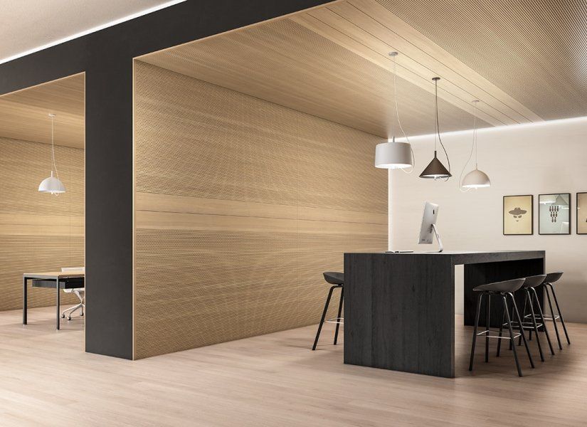 Sistema di contropareti e controsoffitti composto di doghe o pannelli in MDF rivestiti in laminato fresati in superficie e forati all'interno al servizio della fonoassorbenza.