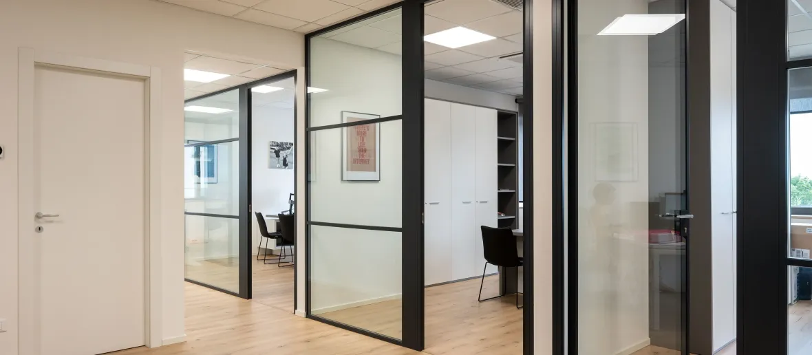 Dividere senza compromettere la luminosità di ciascun ambiente, ma anche archiviare, contenere ed esporre: Progetto Ufficio propone ed allestisce infinite possibilità compositive di pareti divisorie ed attrezzate che arredano le aree di lavoro interpretandone tutte le possibili richieste di privacy acustica e visiva, nonché di allestimento, separando ma al contempo mostrando, per agevolare la comunicazione, funzione lavorativa per eccellenza. Strutture in lamiera d’acciaio caratterizzate da un sistema di montaggio e smontaggio rapido ad incastro tra montanti e traversi, che garantiscono una stabilità statica senza bisogno di controspinta a soffitto.Pareti, di spessore totale 110 mm, che permettono il raggiungimento di un’altezza massima di 3770 mm. Moduli di differenti misure in larghezza e altezza, con possibilità di personalizzazione e di aggiungere fasce di aggiustaggio orizzontali e verticali.Diverse tipologie di telai vetro: vetro doppio spessore 5 mm.(all'interno del vetro è possibile montare delle tendine orientabili), vetro singolo verticale spessore 5 mm., vetro singolo orizzontale spessore 8 mm.Porte completamente reversibili, sia per la tipologia con anta battente che per quella con anta scorrevole, con la possibilità quindi di cambiare apertura al momento del montaggio. Disponibili nelle versioni vetro e legno.