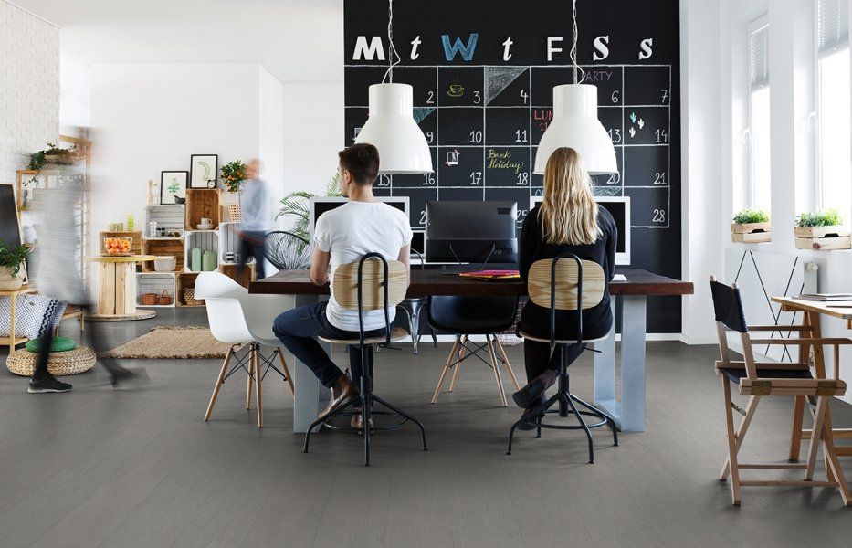 Può il pavimento caldo essere resistente come la pietra e replicarne anche l'estetica? Progetto Ufficio propone collezioni che coniugano la bellezza dei materiali di tendenza come pietra, cemento e metallo alle proprietà di elasticità e leggerezza del legno. Le superfici sono armonizzate con le tendenze moderne della resina ma anche del poro legno declinato in doghe grandi e moderne, dai colori cemento piuttosto che bistro.